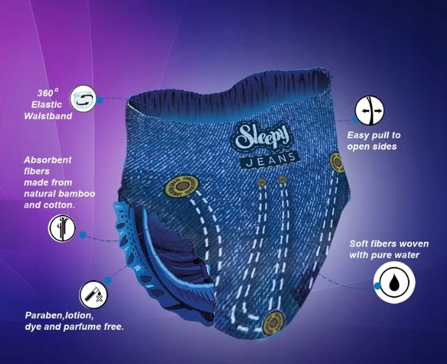 Wyglądające jak prawdziwe spodenki w stylu denim, dają dziecku poczucie pewności i swobody, zachowując jednocześnie wysoką skuteczność chłonności.